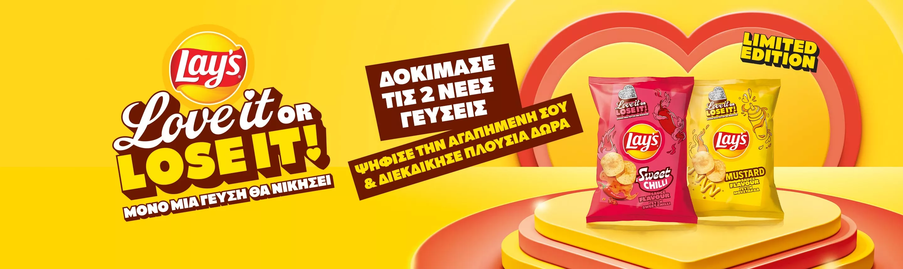 - Διάλεξε μία ως την αγαπημένη σου γεύση μεταξύ των Lay’s Sweet Chili Flavour ή Lay’s με γεύση Μουστάρδα.