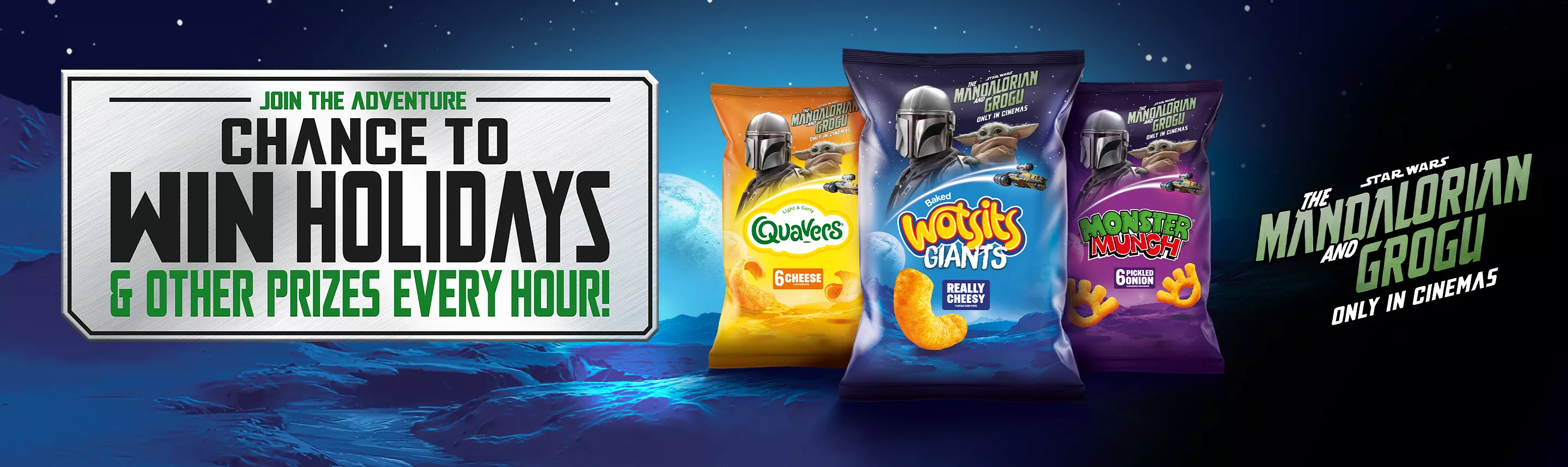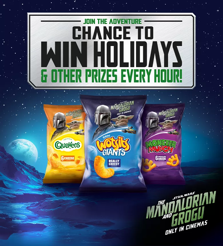 UK & ROI, 18+ only. Online Instant Win: between 7am – 9pm each day, 29/03/26 –05/06/26.​ Purchase required. Prizes: 1 of 2 x 7-night holidays to Tenerife for 2 adults & 2 children incl.​ min 4* accommodation, return flights, airport transfers & 4 activities, 1000’s of THE​ MANDALORIAN & GROGU merch in 2 varieties, 1,000 x pair of cinema tickets (UK: Vue only;​ ROI: see T&Cs for participating cinemas) for THE MANDALORIAN & GROGU, valid between​ 22/05/26 – 22/08/26. Booking fees may apply. Wrap Up Draw: Enter between 06/06/26 –​ 31/08/26 to enter the draw. Wrap Up Prizes: 10 x THE MANDALORIAN & GROGU merch.​ Max 1 entry per person per day. Max 1 Prize type per person. Internet access required. Visit​ https://www.joy-pepsico.eu/en-gb/walkers/TheMandalorianAndGrogu for full T&Cs & Prize​ details. Promoter: Walkers Snacks Ltd and PepsiCo Ireland Food & Beverages Unlimited​ Company. The Walt Disney Company and their respective parent, affiliates, and subsidiaries​ are not responsible for the promotion, administration or execution of the competition.