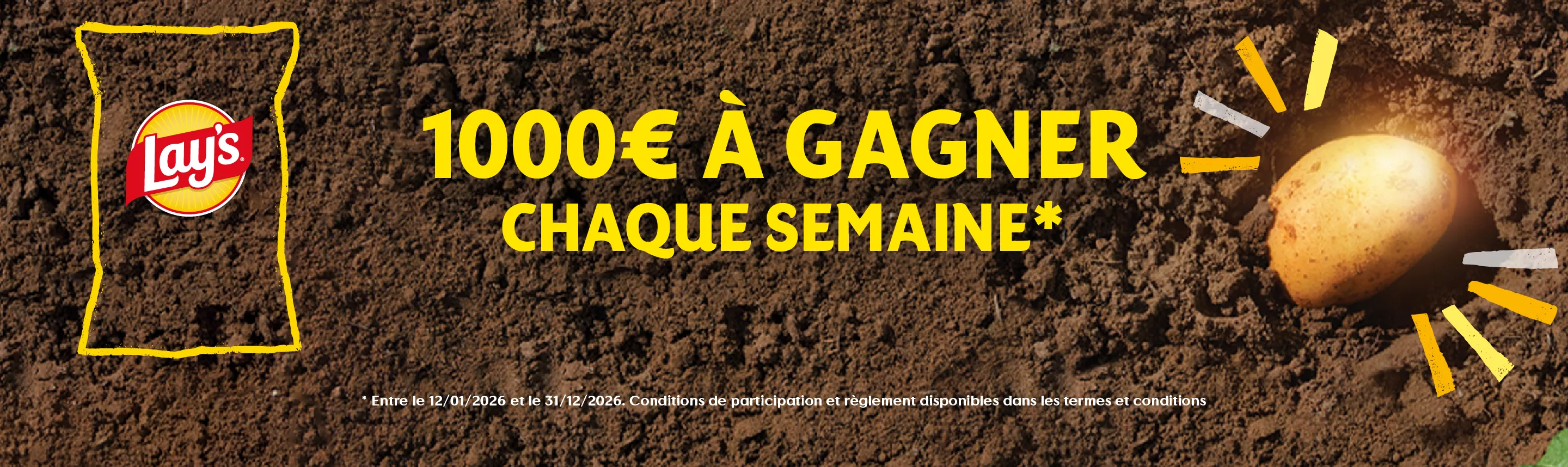 Le jeu consiste, sur un champ de pomme de terre virtuel, à sélectionner une parcelle de terrain, puis gratter la terre, en déplaçant le curseur sur l’écran, pour découvrir ce qui s’y cache. Le joueur remportera le lot qu’il découvre (sous réserve que la participation soit conforme au règlement). La pomme de terre d’or correspondant au lot de CATEGORIE 1 (virement de 1000 euros) et l’article Lay’s au lot de CATEGORIE 2 dont le modèle peut varier par rapport à l’image. Si un lot de CATEGORIE 1 ou 2 déjà remporté est découvert, il ne sera remis au participant qu’une seule fois sur toute la durée du jeu. Si rien n’est découvert, un lot de CATEGORIE 3 (bon de réduction de 30 centimes) sera attribué.