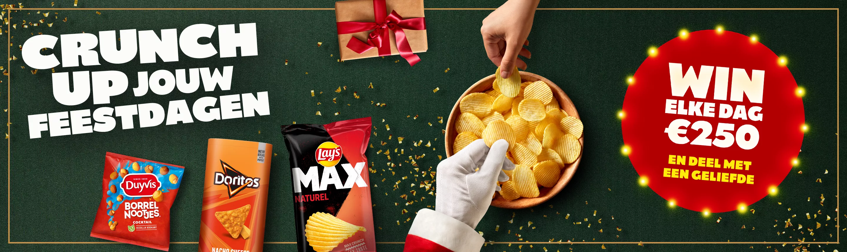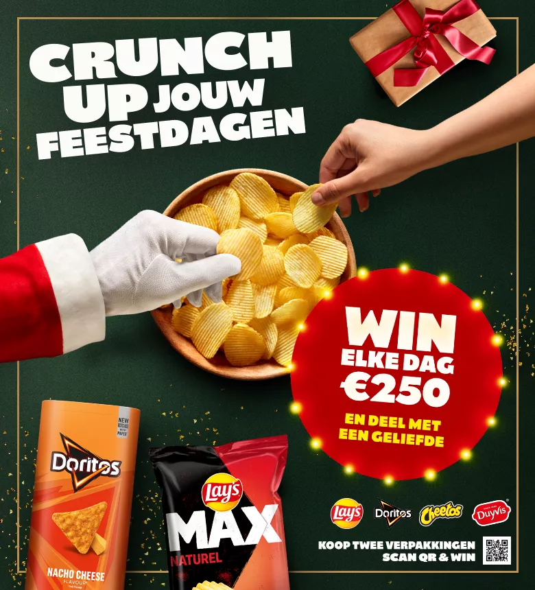 Doe mee met onze CRUNCH UP jouw feestdagen promotie en maak elke dag kans op €250 om met een geliefde te delen! Koop twee verpakkingen van Lay's, Doritos, Cheetos of Duyvis, scan de QR-code op het POS materiaal in de winkel of op de flyer, log in/registreer op Joy en ga naar de actiepagina. Upload je kassabon en beantwoord de prijsvraag!