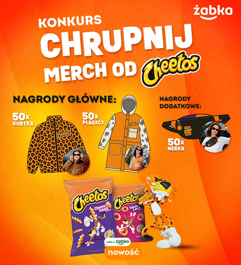W tym konkursie do wygrania jest 50 nagród głównych nr 1 w postaci kurtki Cheetos, 50 nagród głównych nr 2 w postaci płaszcza Cheetos oraz 50 nagród dodatkowych w postaci nerki Cheetos.
