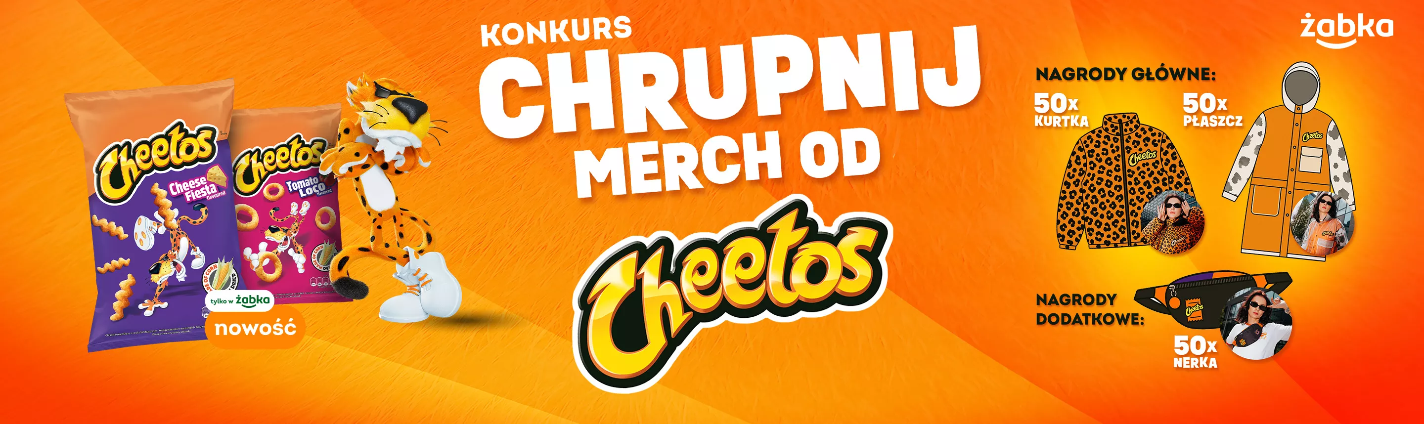 Sprzedażą promocyjną objęte są produkty marki Cheetos (wszystkie warianty smakowe i rozmiary opakowań) oferowane przez sklepy Żabka na terenie Rzeczypospolitej Polskiej - szczegółowe informacje znajdziesz w załączniku nr 1 do regulaminu.
