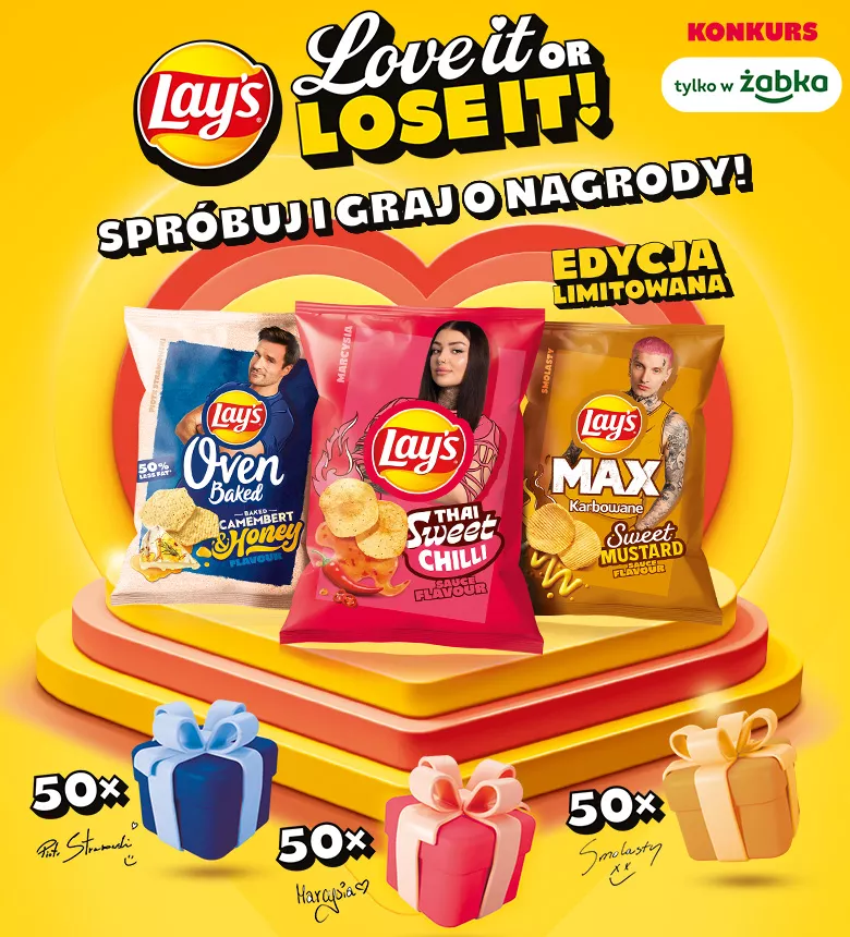 Sprzedażą promocyjną objęte są produkty marki Lay’s (wszystkie warianty smakowe i rozmiary opakowań) oferowane przez sklepy Żabka na terenie Rzeczypospolitej Polskiej- szczegółowe informacje znajdziesz w załączniku nr 1 do regulaminu.